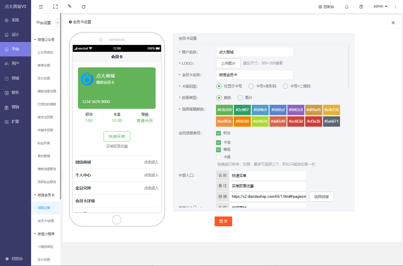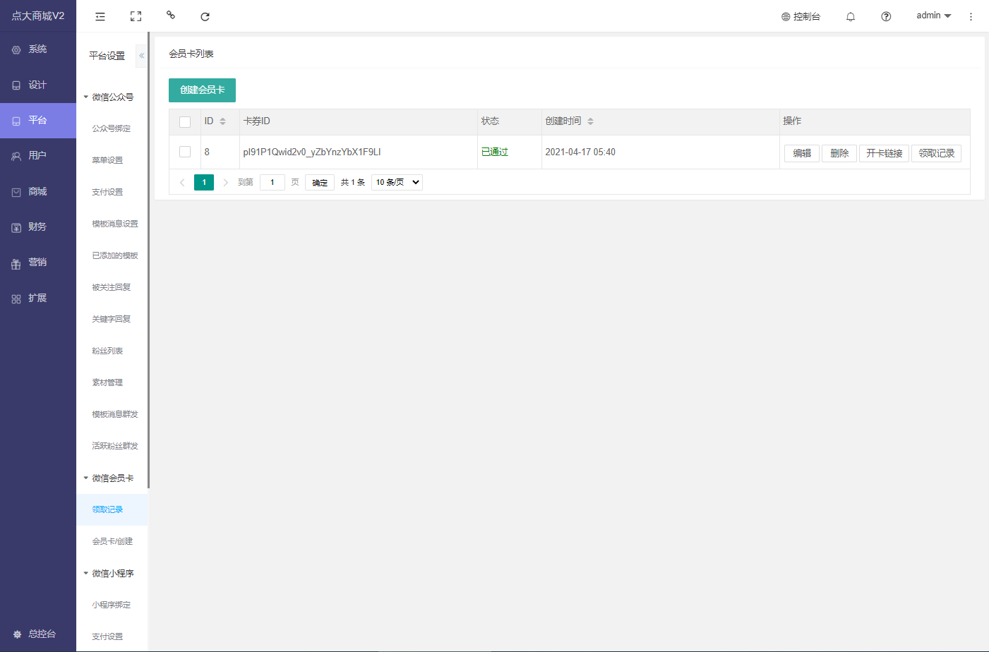注:创建会员卡前需要申请服务号并在后台-平台-微信公众号里配置,并登录微信公众平台—公众号登录—功能—卡券,开通卡券功能,制卡模式选择普通模式查看会员卡创建会员卡
