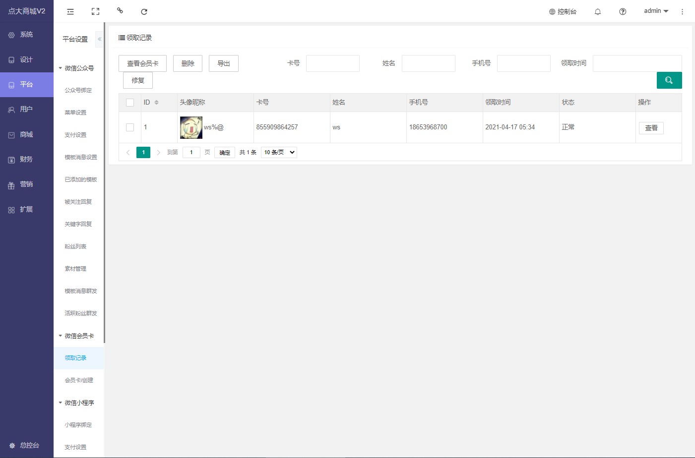 用户微信会员卡领取信息的查看和管理,查看会员领取时间,进行删除,导出等操作,根据卡号信息等进行查询