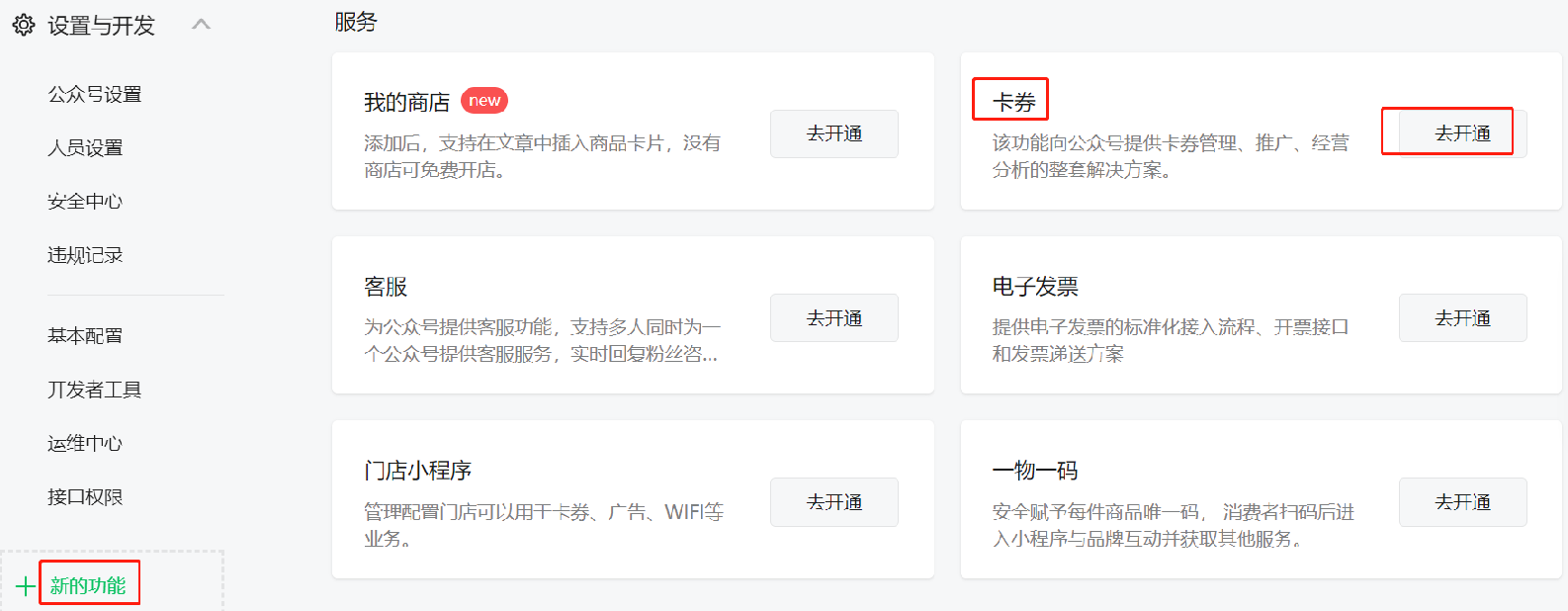 会员卡创建注:创建会员卡前需要申请服务号并在后台-平台-微信公众号里配置,并登录微信公众平台—公众号登录—功能—卡券,开通卡券功能,制卡模式选择普通模式查看会员卡创建会员卡