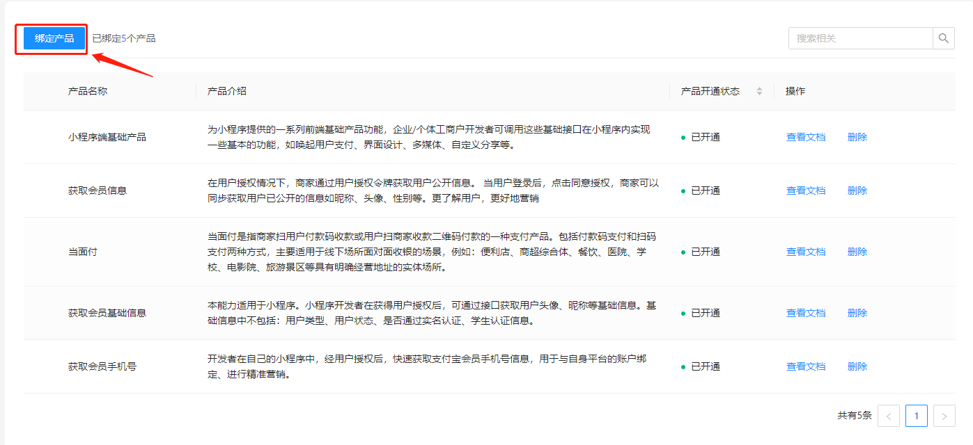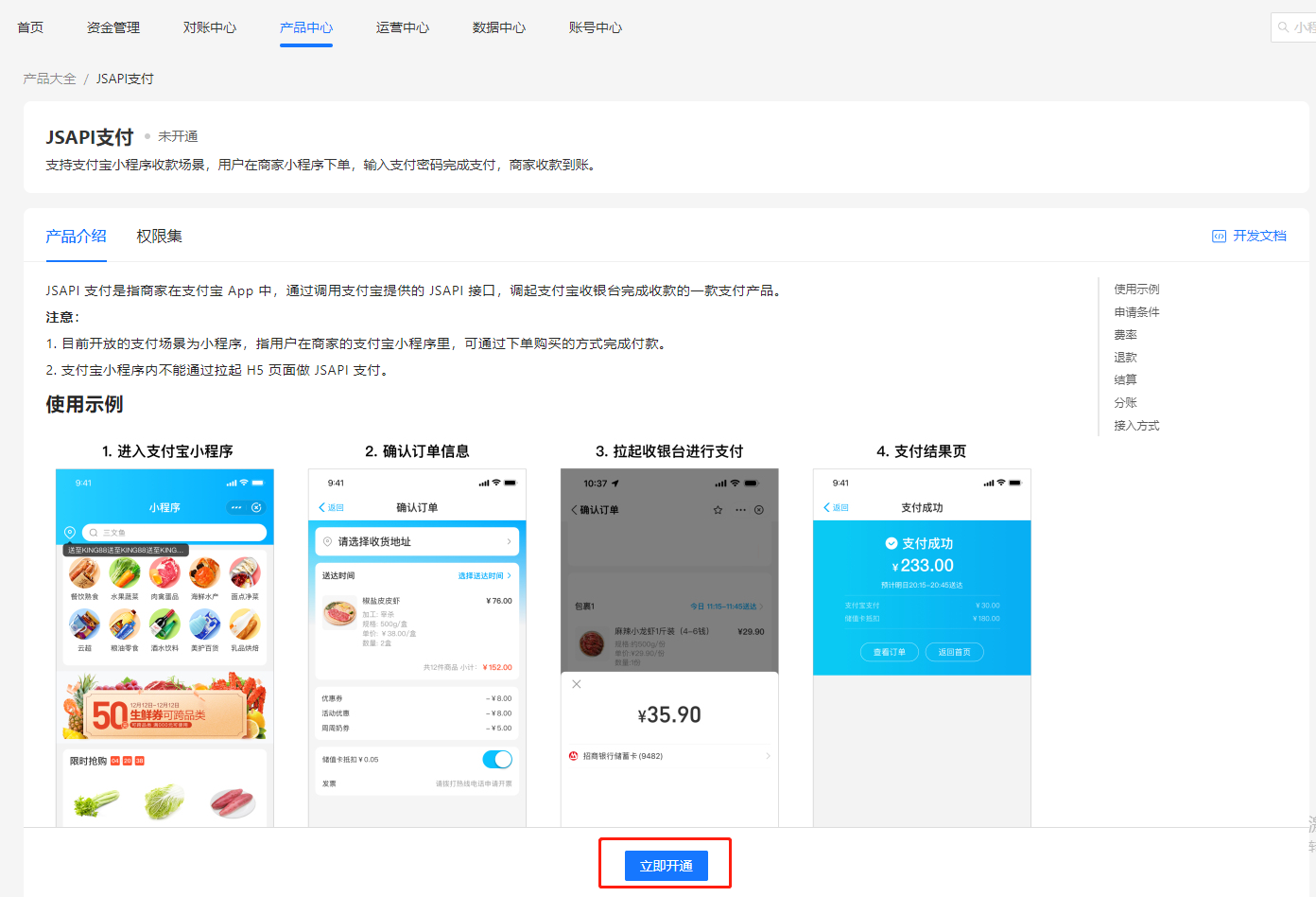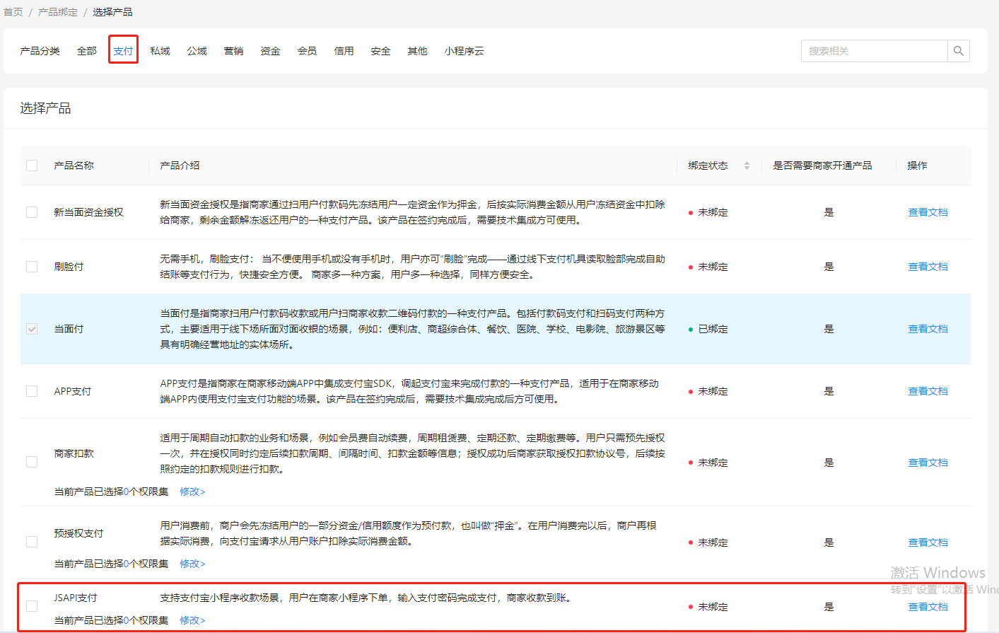 JSAPI支付功能需要在对应支付宝小程序里找到产品绑定-绑定产品选择JSAPI支付,如果显示未绑定需要登录商家平台-产品中心-产品详情页点击立即开通