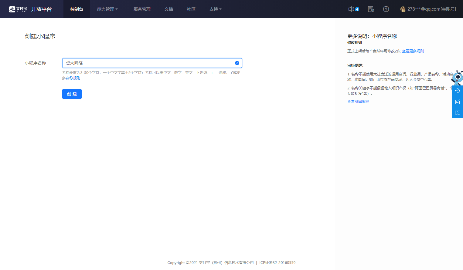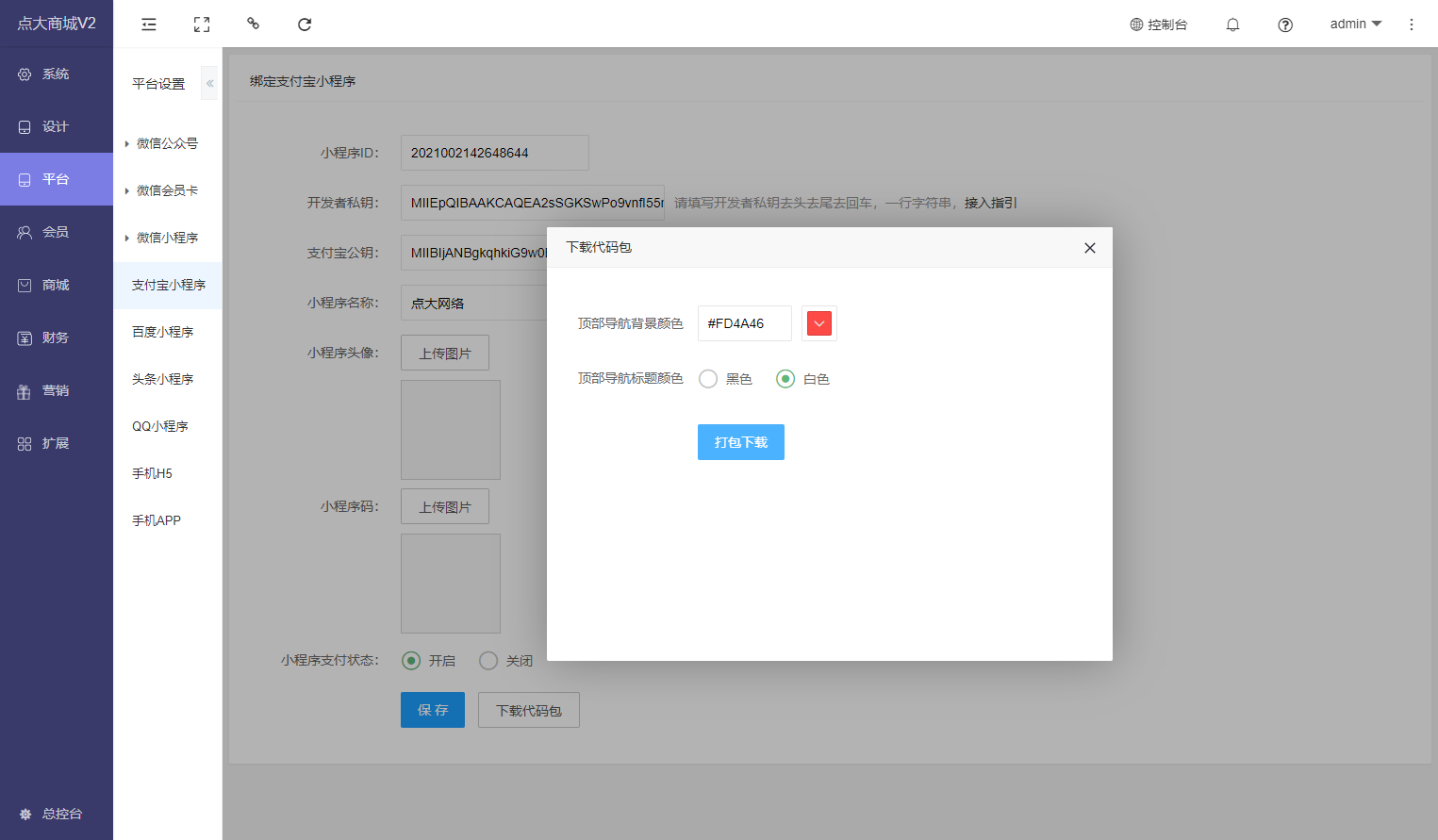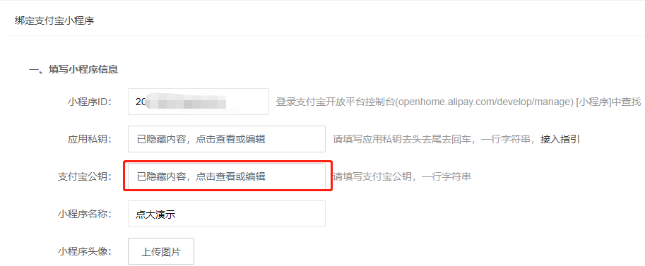点击保存设置后 复制支付宝公钥到商城的支付宝公钥中,将小程序ID,小程序名称等信息完善后保存