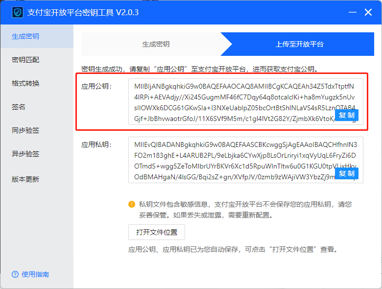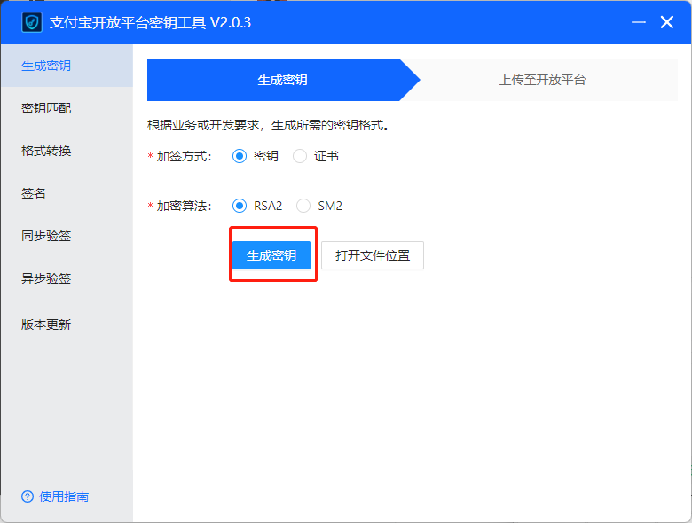 使用支付宝Web在线加密工具生成密钥 https://opendocs.alipay.com/common/02kipl