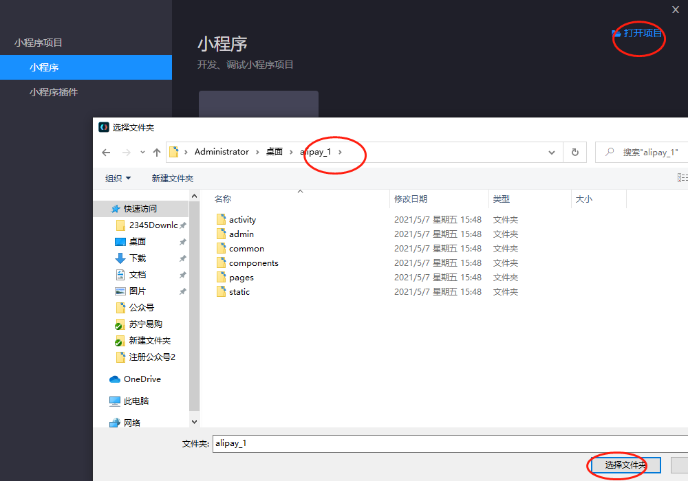 2、选择打开项目,将下载并解压后的小程序代码包导入到开发者工具