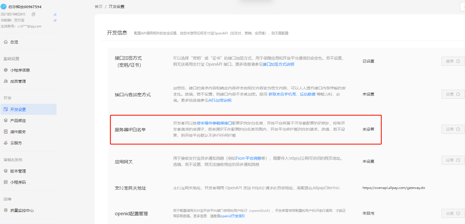 创建完成后在[开放设置]中配置小程序信息,配置IP白名单,如果不设置白名单则默认没有任何拦截