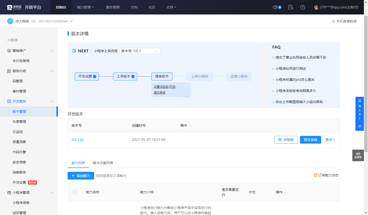 上传完成后 在支付宝开放平台对应的小程序版本管理中进行预览提交审核等操作