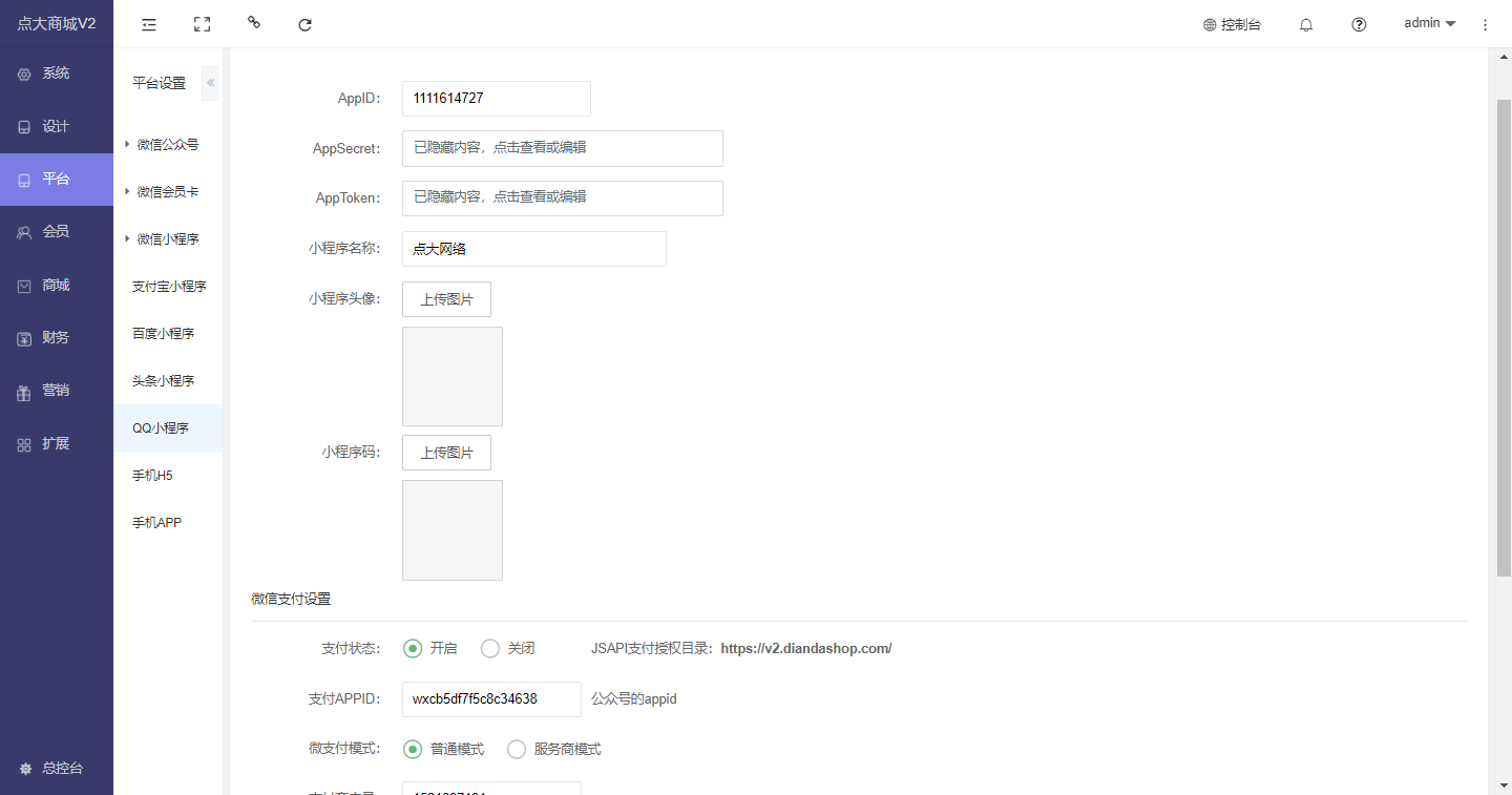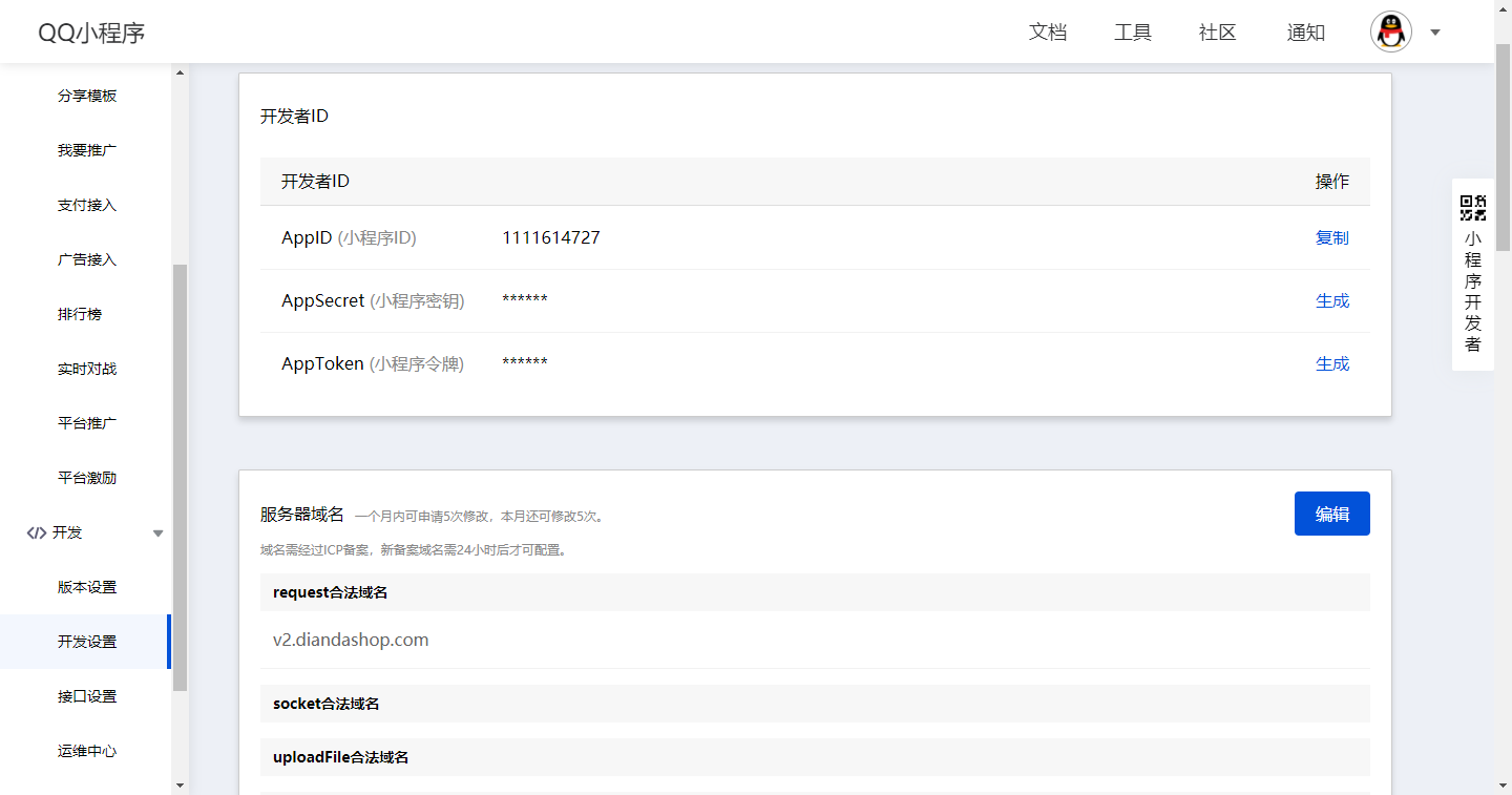在开发-开发设置中填写服务器域名,并将AppID AppSecret等信息对应填写到商城后台