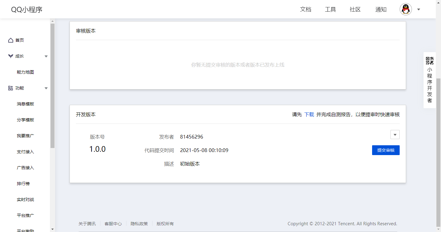 然后下载小程序代码包,使用QQ小程序开发者工具上传代码,提交审核