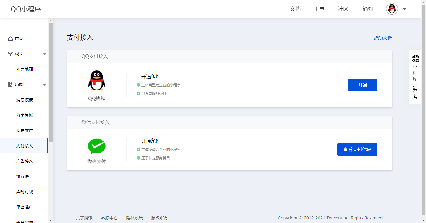 创建完成后进入小程序管理中心 功能-支付接入 中开通微信支付接入