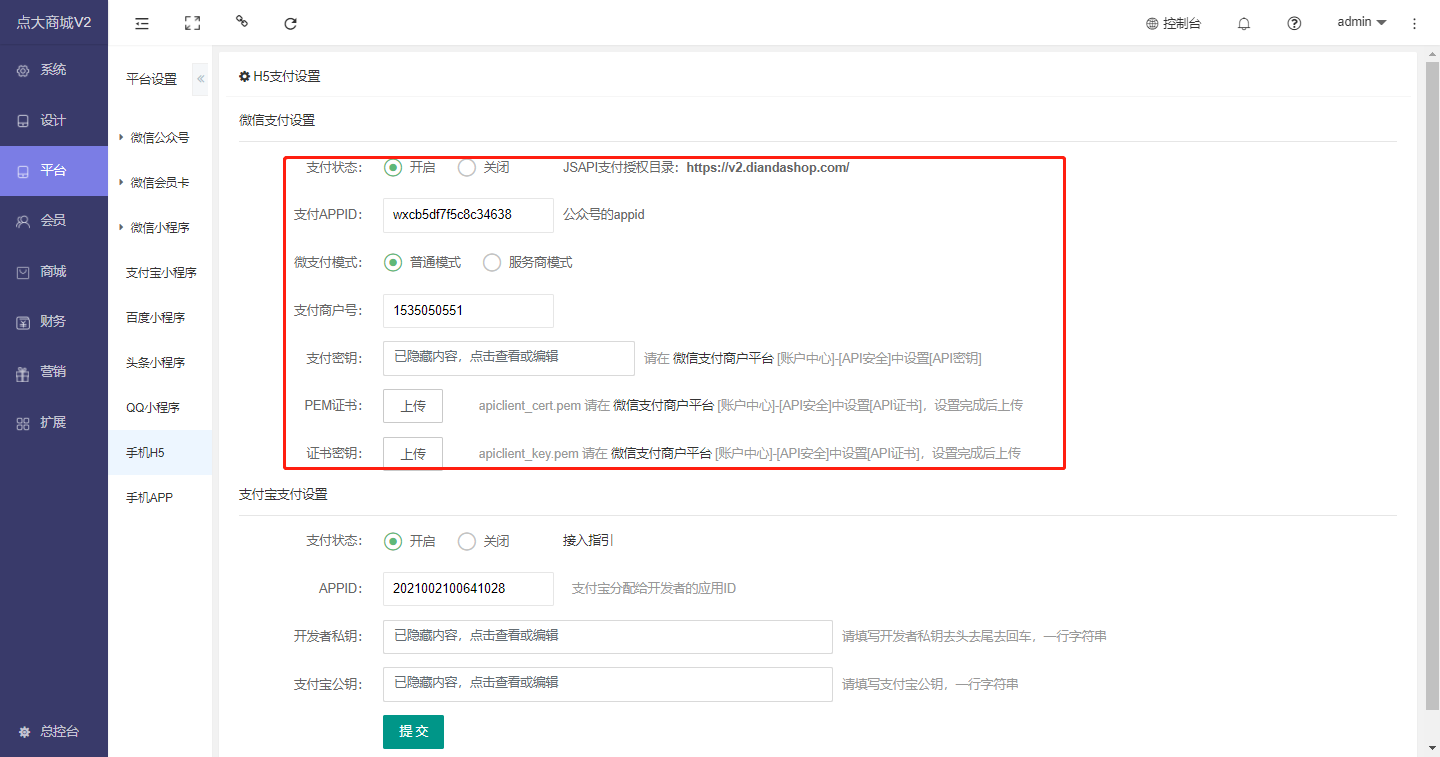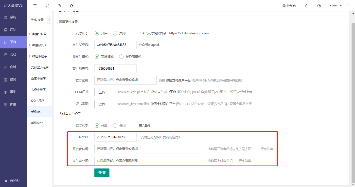开通并设置完成后将支付信息填写到商城后台