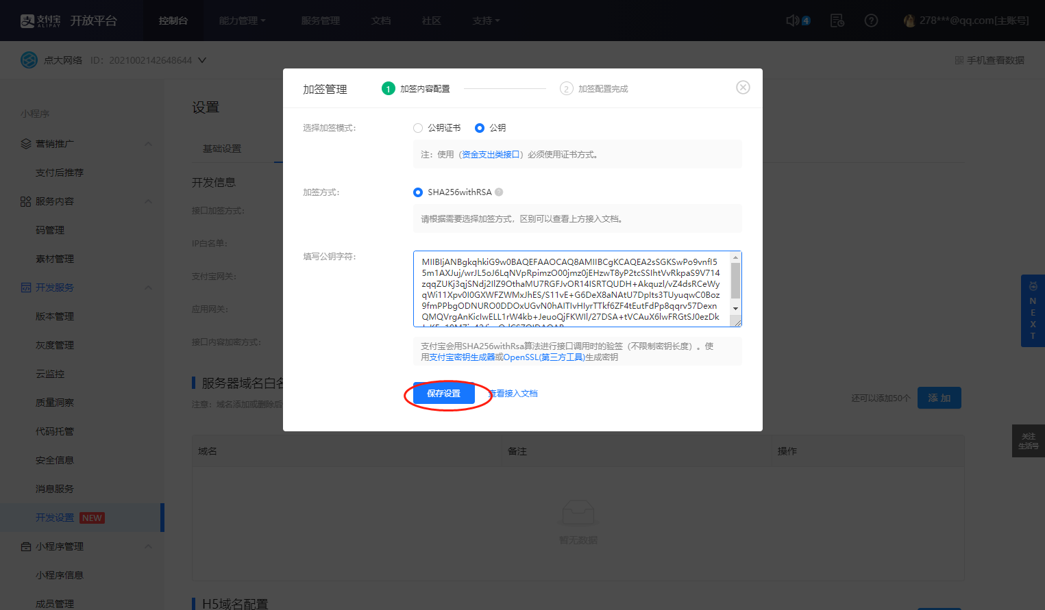 点击保存设置后 复制支付宝公钥及APPID填写到商城后保存