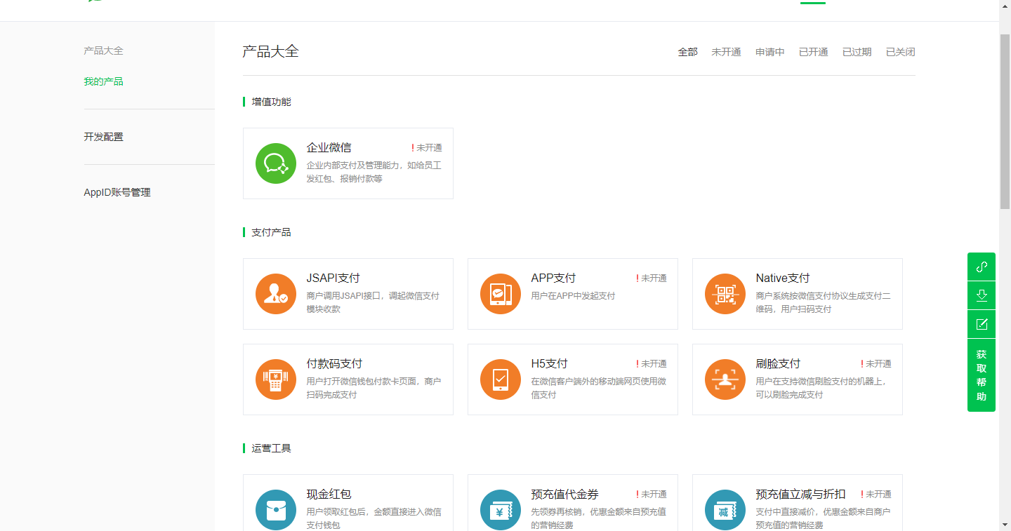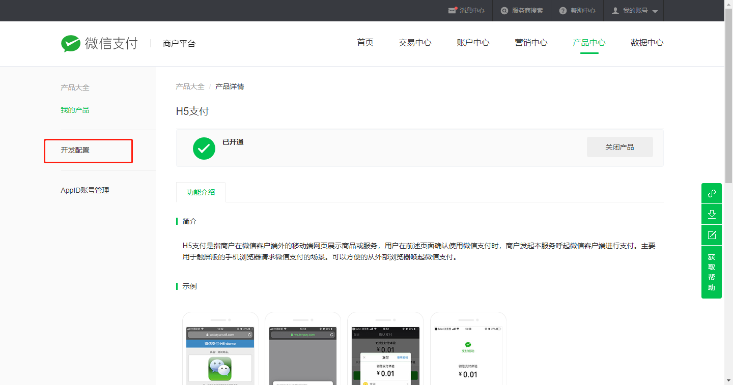 在产品中心找到H5支付,点击进入申请开通