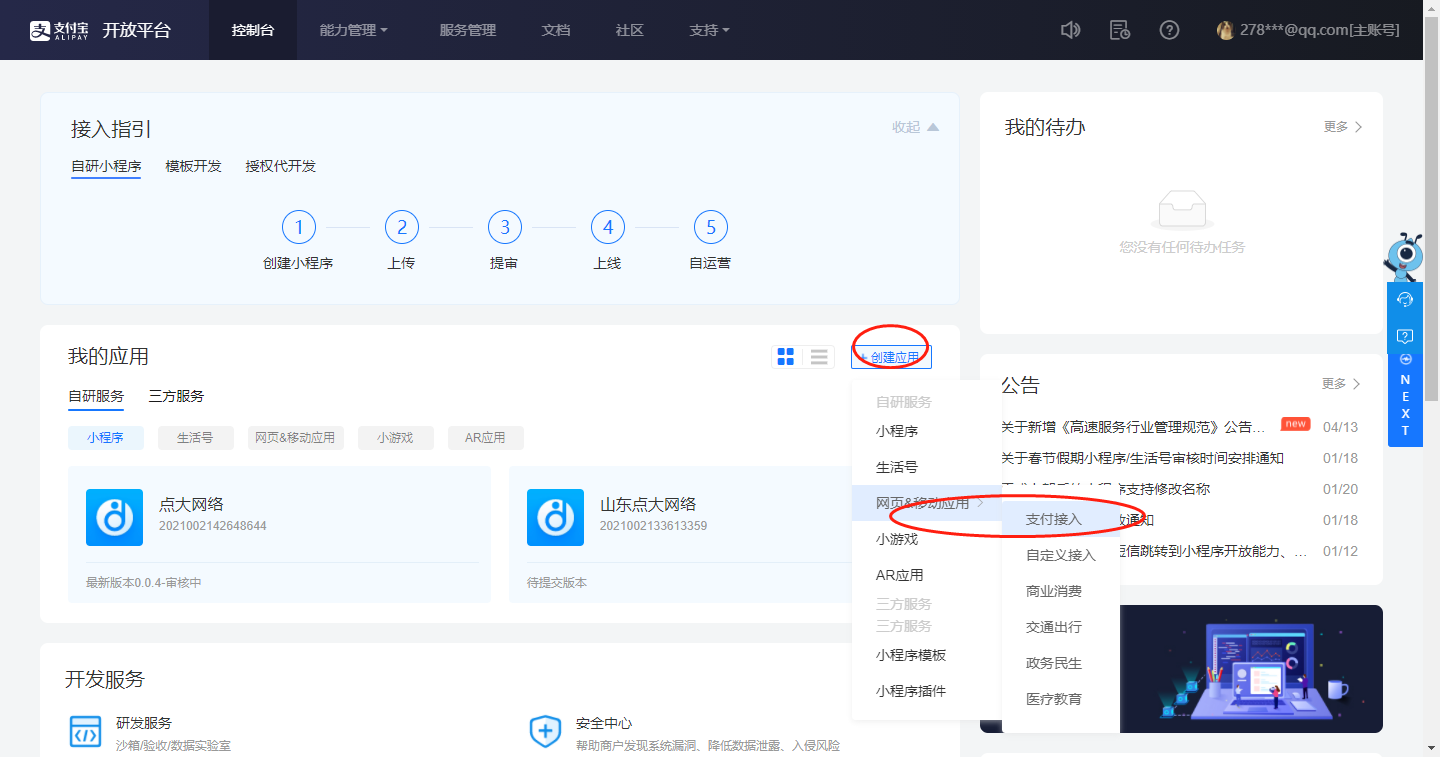 首先登录支付宝开放平台创建网页&移动应用