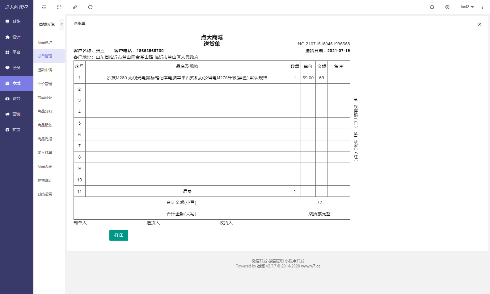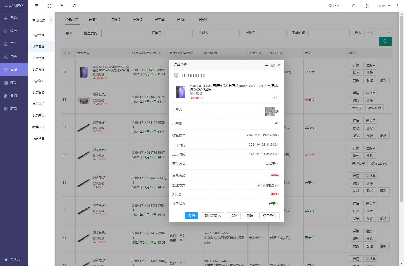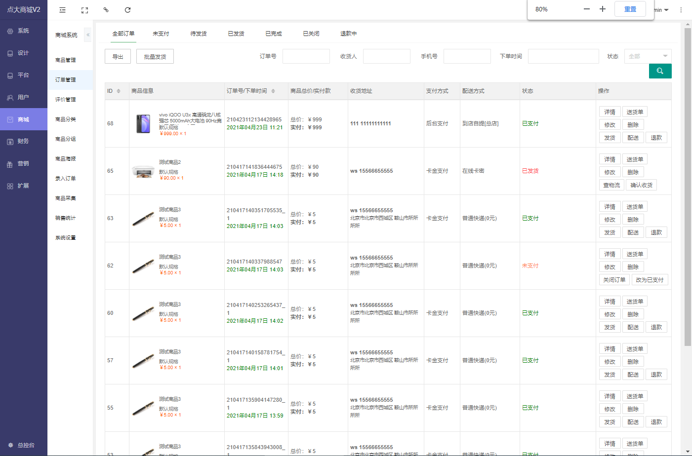 用于查看订单、导出订单、筛选订单、批量发货、修改订单,删除订单等操作。