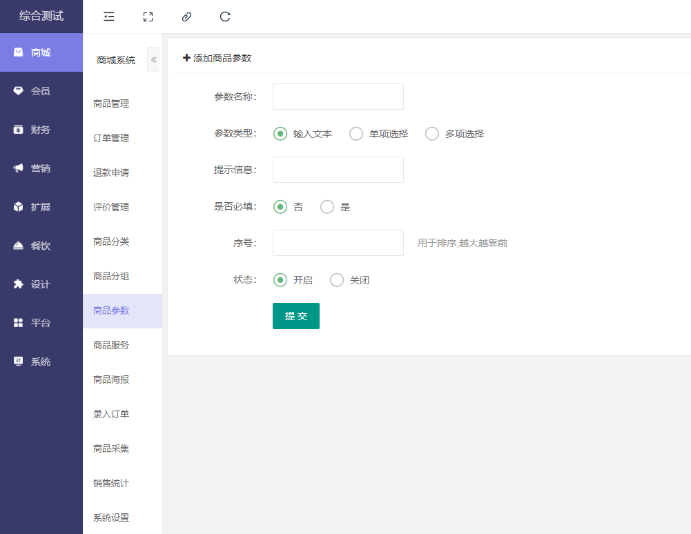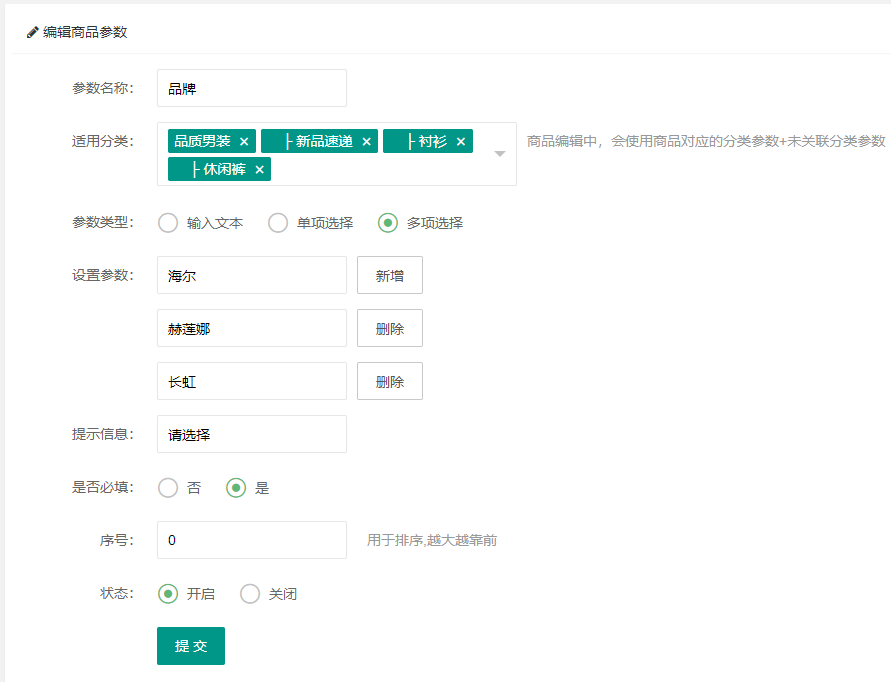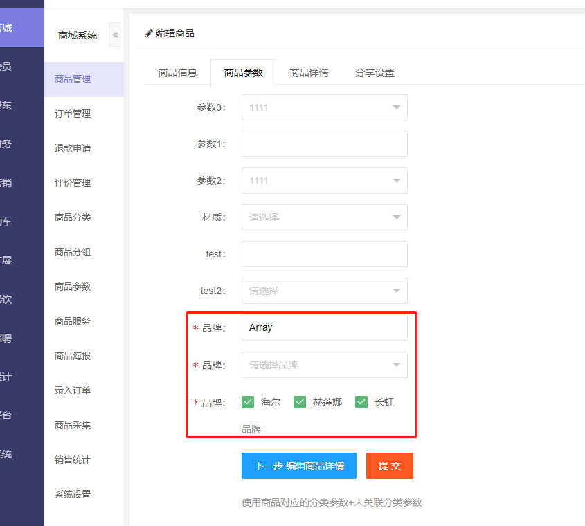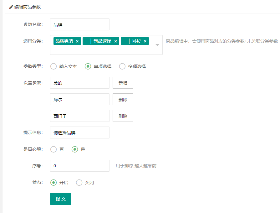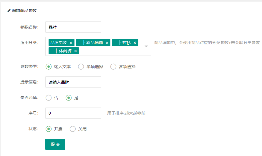 参数类型:输入文本,单项选择(设置品牌类型用于单项选择),多项选择(设置品牌类型可多项选择)