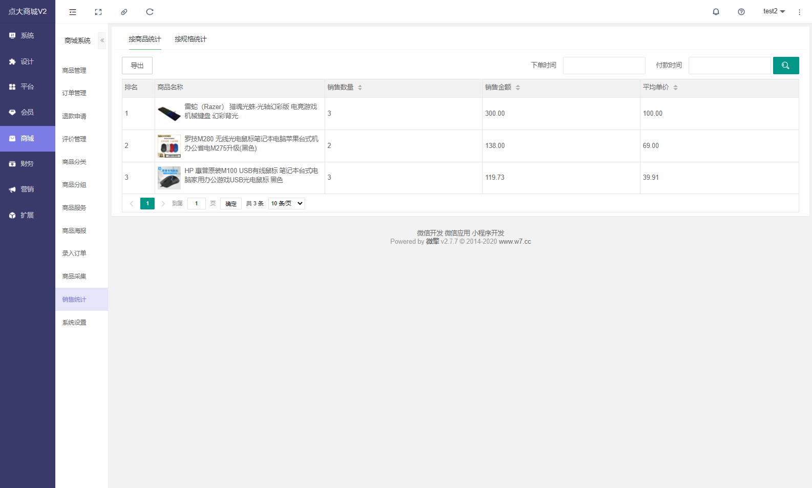 用于查看各个商品的销售情况及销售排名,可按照商品统计,也可以按照规格进行统计,导出数据,筛选数据。