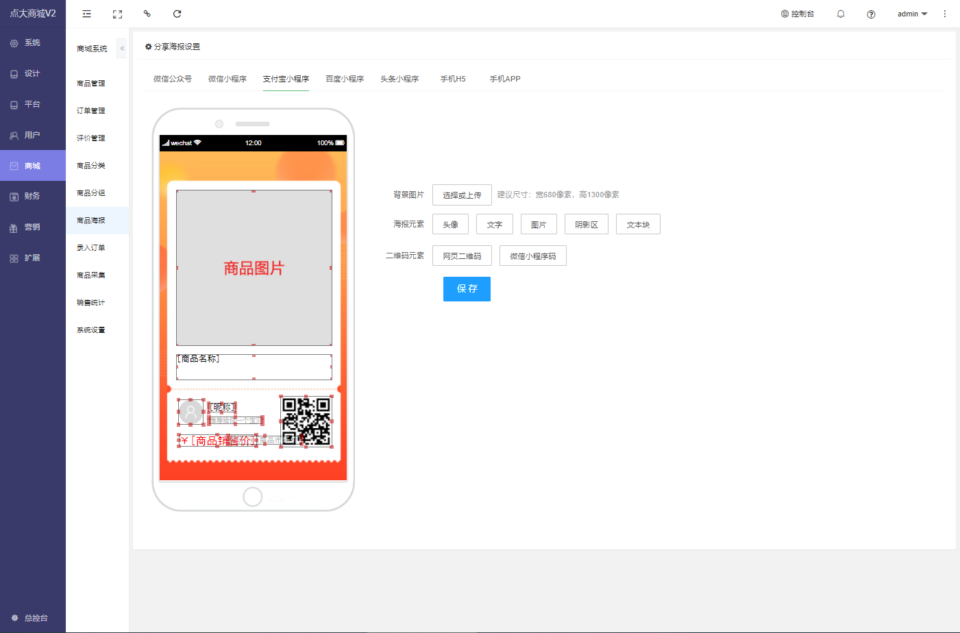 用于商品海报设置,设置头像,文字,二维码,微信小程序码,图片,商品图片,阴影区,文本块等多项元素。