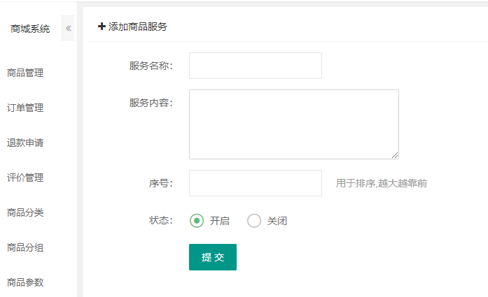 退货退款:开启;关闭(关闭后用户无法申请退款退货)
