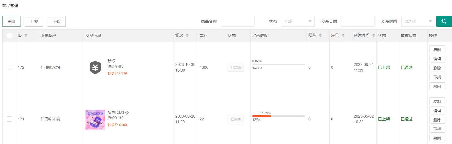展示多商户的秒杀商品,平台可以对商品进行删除、上架、下架、编辑、删除等操作