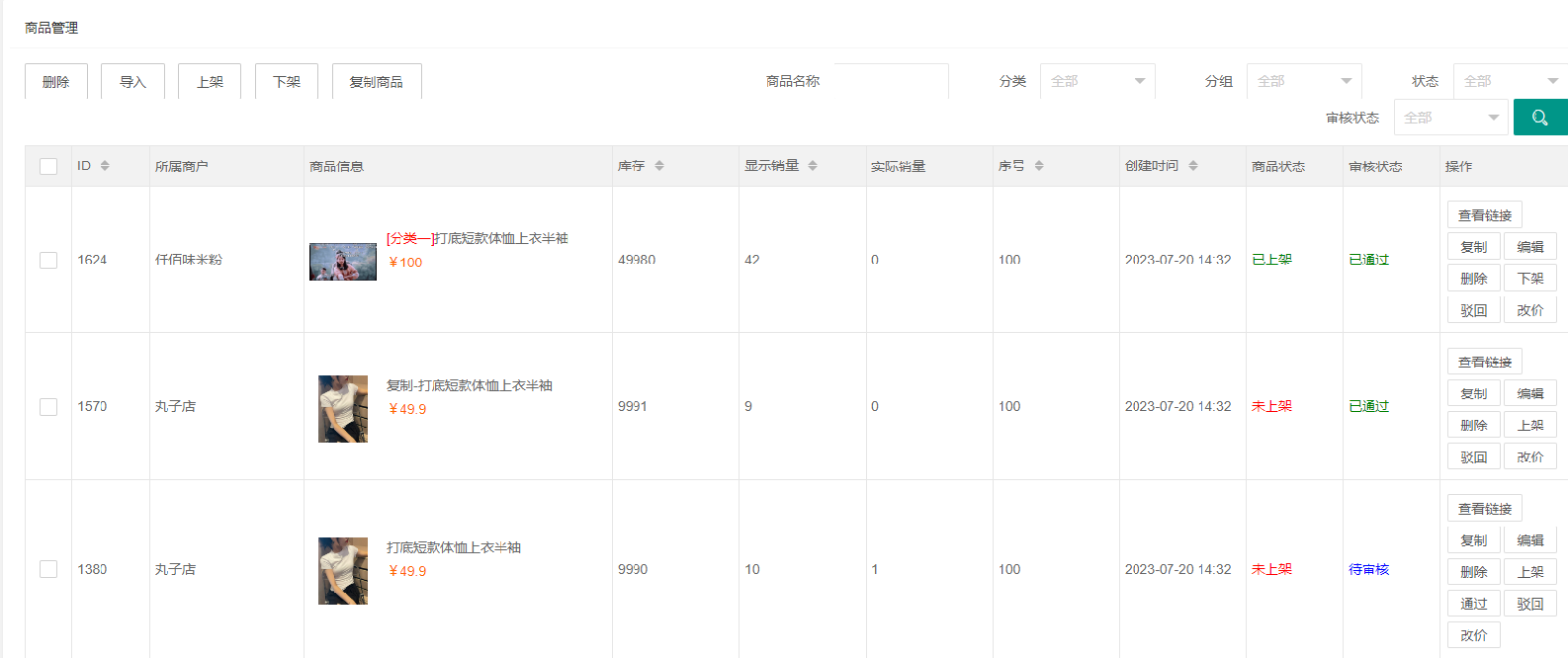 展示各商家的商品,可以进行删除、导入、导出、复制商品、审核、驳回等操作