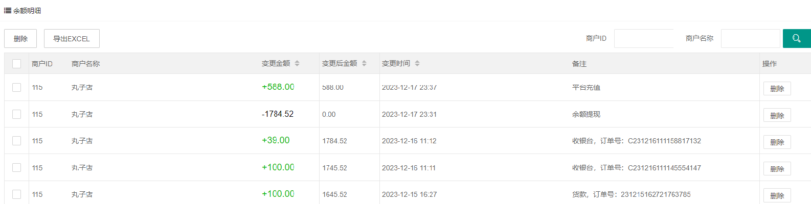 记录商家余额明细,查看变动详情,记录变更前后信息,查看变更详情备注