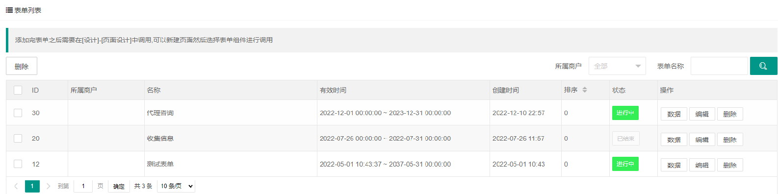 展示多商户的自定义表单,添加完表单之后需要在[设计]-[页面设计]中调用,可以新建页面然后选择表单组件进行调用