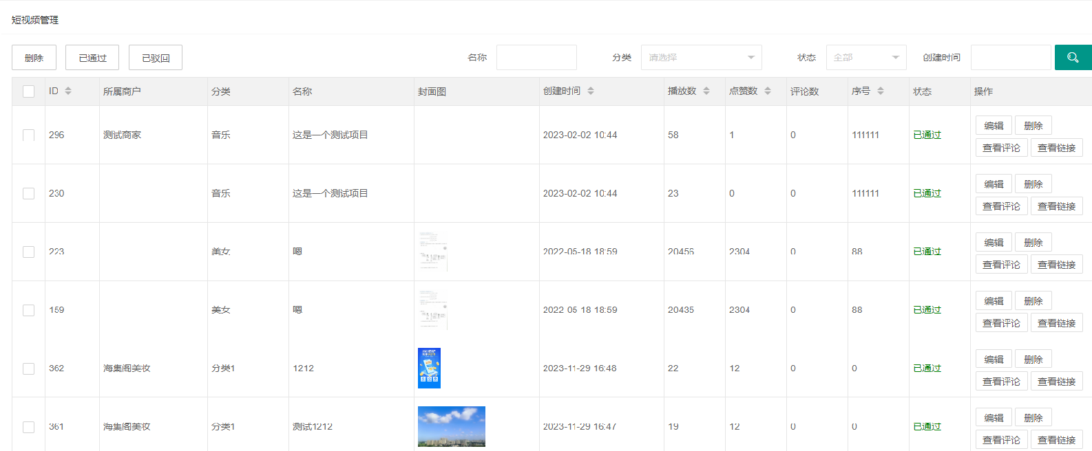 展示多商户的短视频列表,可以对短视频进行删除、通过、驳回、编辑、查看评论、查看链接等操作