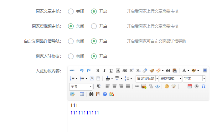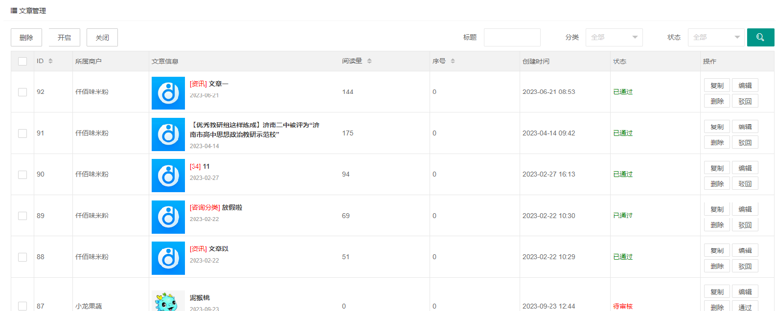 多商户 文章列表,可以操作删除、开启、关闭、审核、驳回等操作