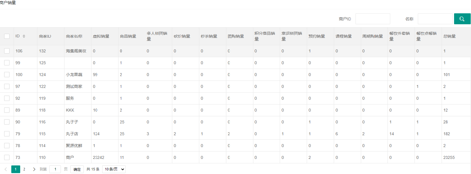 商户销量:统计平台和多商户的销量(包括虚拟销量和实际销量),统计类型:商城商品、多人拼团、砍价、秒杀、团购、积分兑换、幸运拼团、预约服务、知识付费、周期购、餐饮外卖和点餐,可以通过商户id和名称进行检索