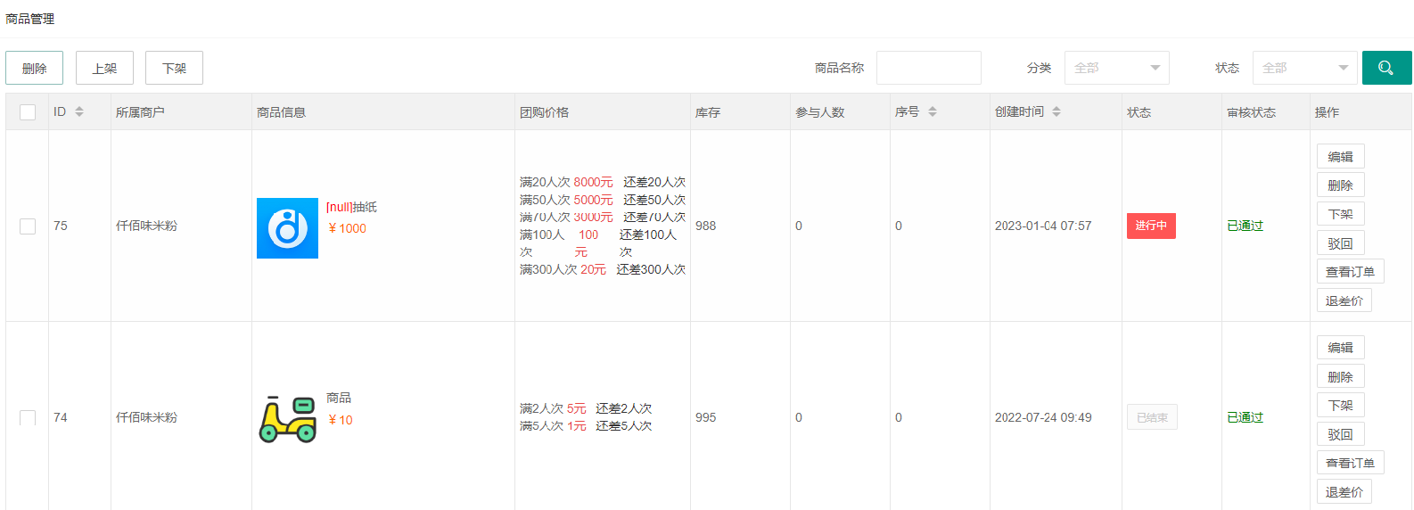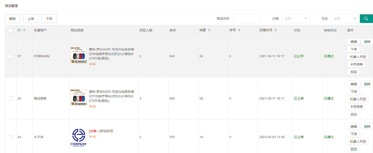 展示多商户的拼团商品,平台可以对商品进行删除、上架、下架、编辑、删除等操作