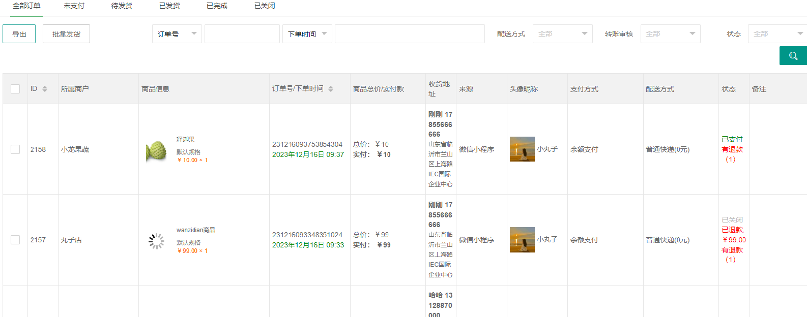 商户订单:记录商户订单,进行订单查看,发货,打印商品单,查看物流,售后等操作