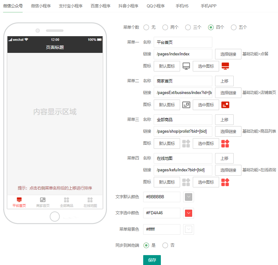 设置多商户的默认导航,支持微信公众号、微信小程序、支付宝小程序、百度小程序、抖音小程序、QQ小程序、手机H5、手机APP