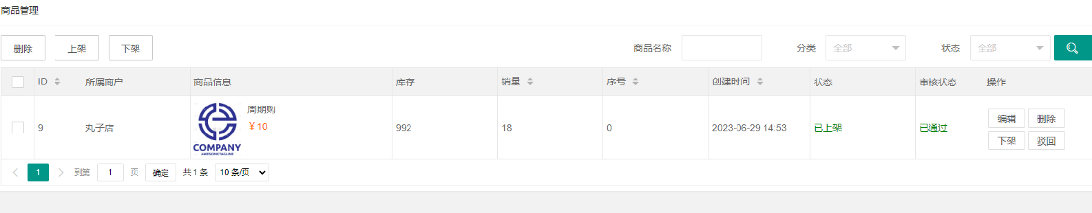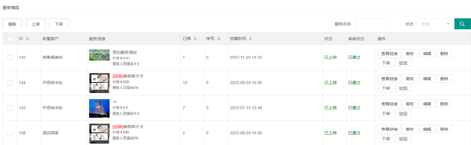 展示多商户的服务商品,平台可以对商品进行删除、上架、下架、编辑、删除等操作