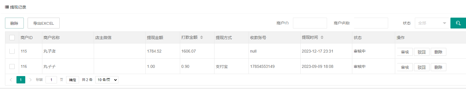 多商户的提现记录,可以操作审核、驳回、删除、导出表格记录,通过商户id、商户名称、状态进行审核