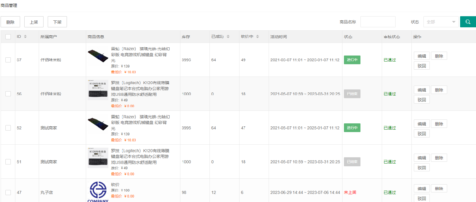 展示多商户的砍价商品,平台可以对商品进行删除、上架、下架、编辑、删除等操作