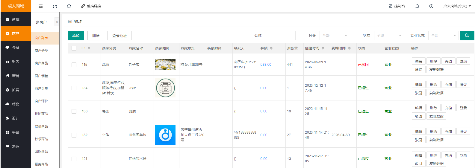 展示多商户的团购商品,平台可以对商品进行删除、上架、下架、编辑、删除等操作