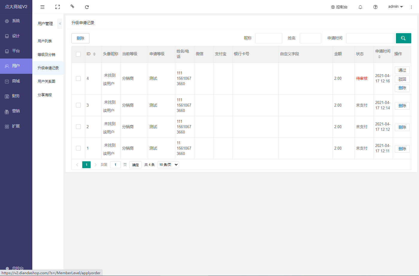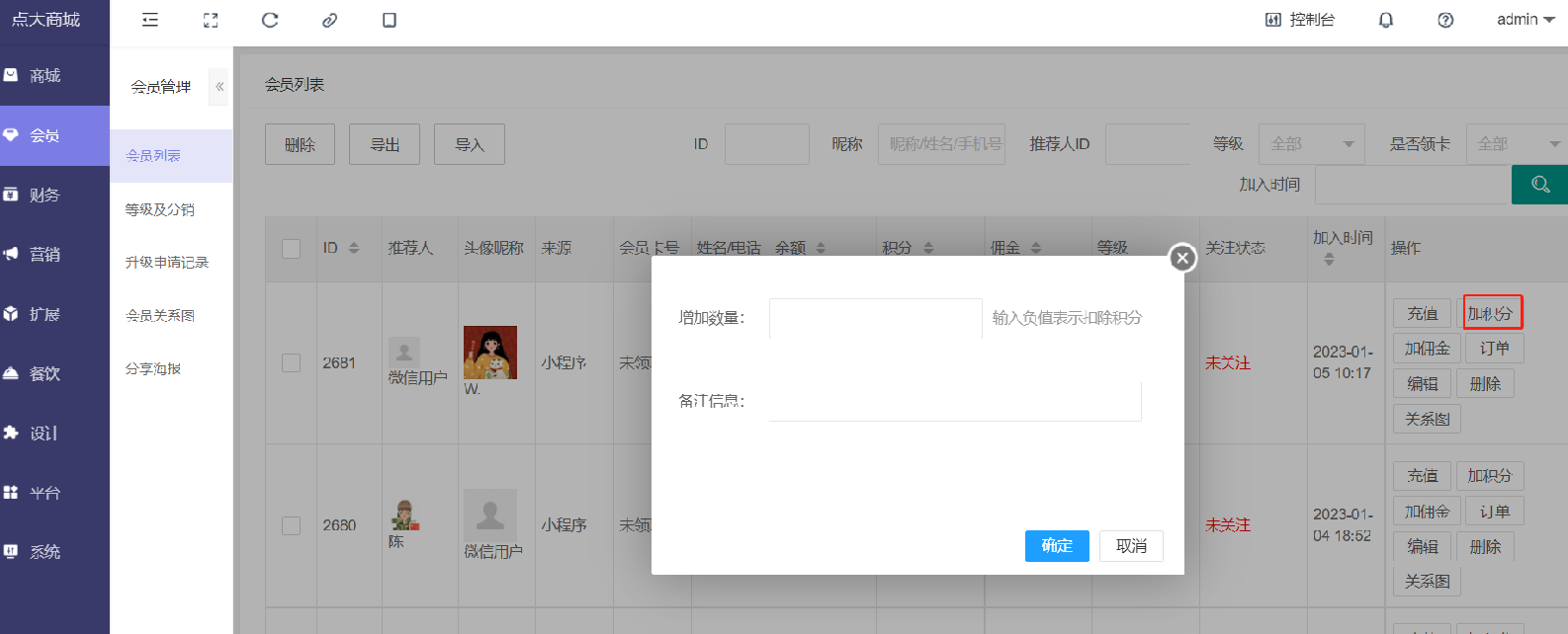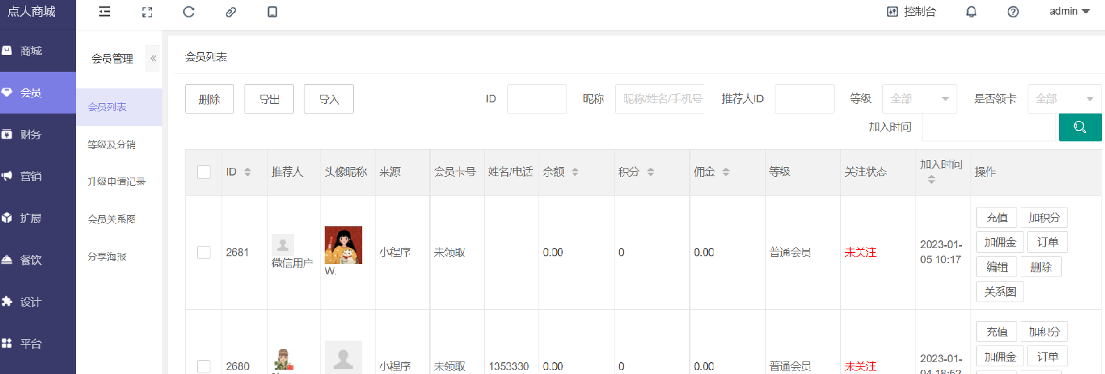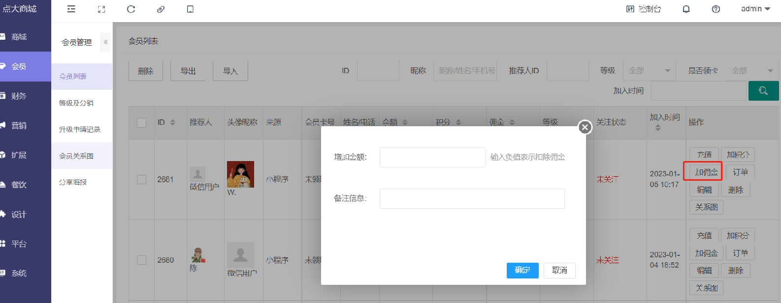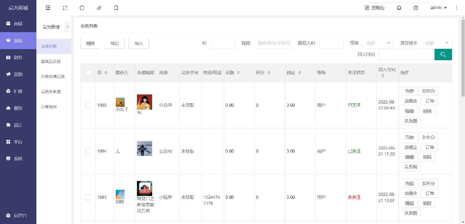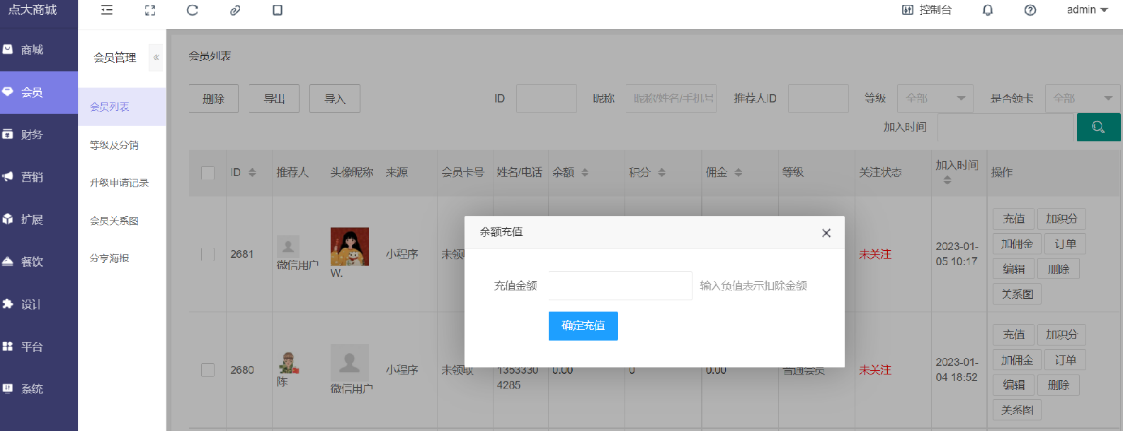 充值,加积分会员列表可以用于会员资金管理,可以添加和减少余额,积分,佣金